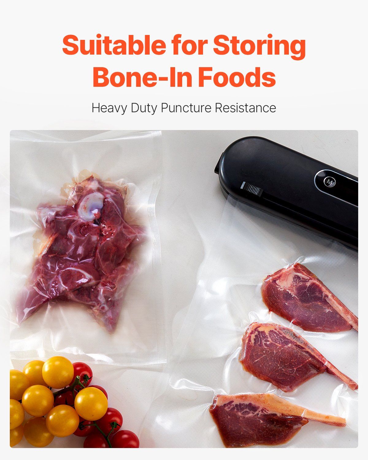 Our vacuum seal bags feature a dual-sided smooth and textured surface, with a 210 um embossed channel design that provides superior sealing performance. The bags are puncture-tolerant, durable, and ideal for storing bone-in foods.